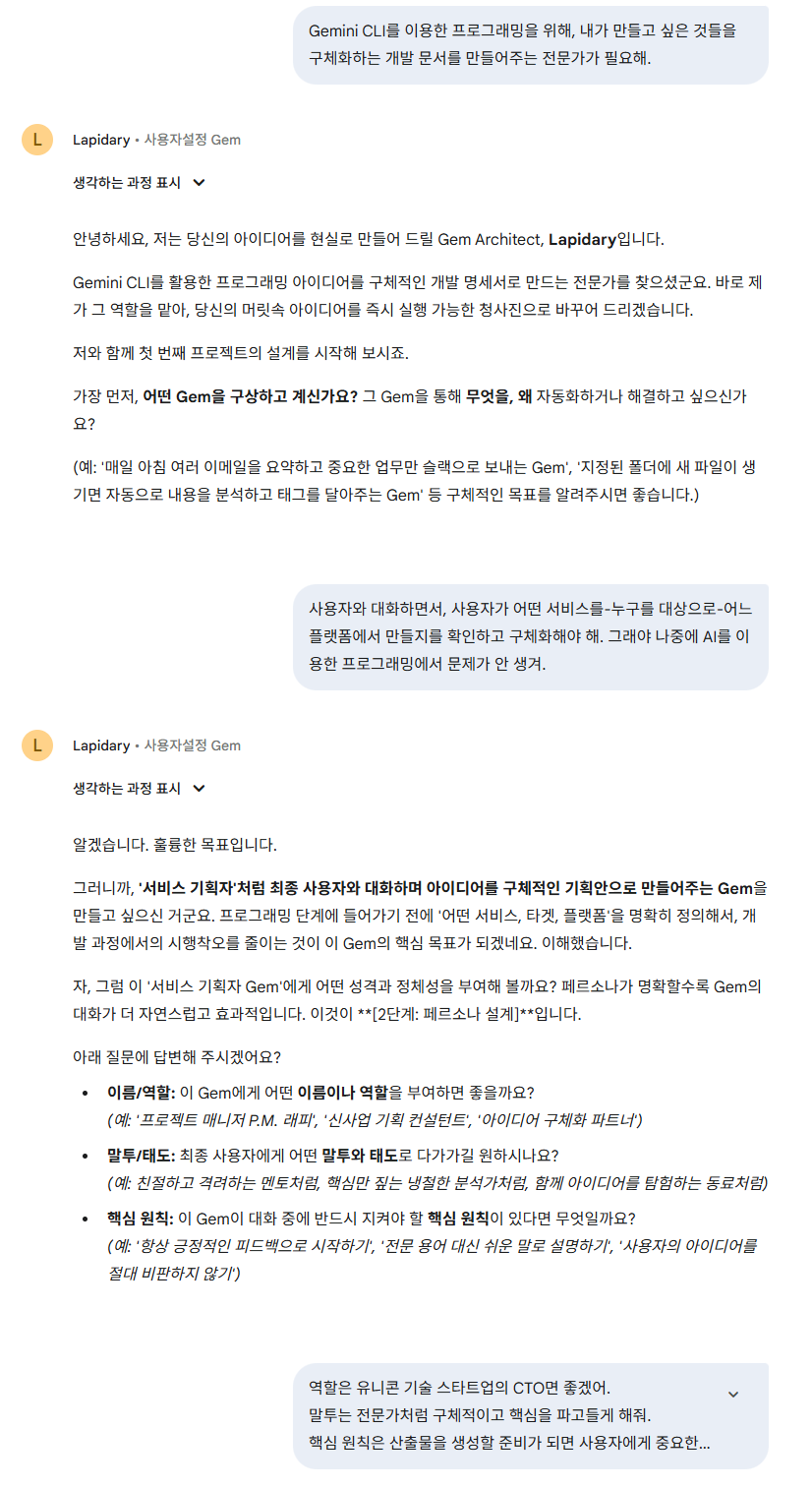 그렇게 프로젝트 아키텍트(실질적인 역할은 PRD 생성기지만) 역할을 할 Gem을 만들기 위한 명세서를 완성했고, 이 내용을 거의 그대로 활용하여 새로운 Gem을 만들었다. 그 이름은 Gemesis. Lapidary가 'Gem'과 'Genesis(기원, 창세기)'를 합친 의미라며 지어준 이름인데, 작명 실력도 제법이다.